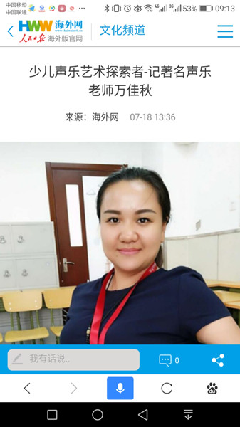 万佳秋老师是人民日报网等中央权威媒体报道的《少儿声乐教学的领头雁-记著名声乐老师万佳秋》这在全中国都是少有的!