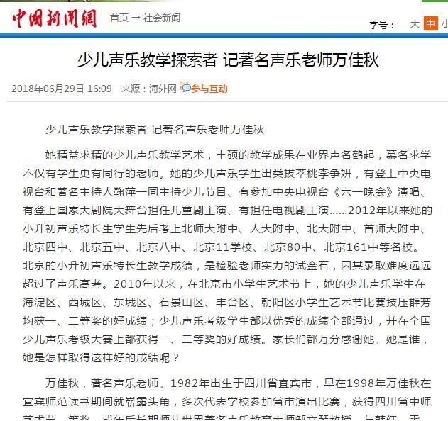 中国人民政府门户网站新华网、人民网、光明网、央视网、中国网、中国新闻网、中国日报网、中国青年网、中国首都网等权威媒体集中报道万佳秋,这在全中国都是少有的! 中央电视台家属孩子、中央电视台银河少年艺术团的孩子......都找万佳秋老师学习,就连中国音乐学院权威的声乐老教授都赞叹不已,介绍孩子找万佳秋学习!