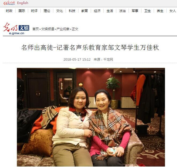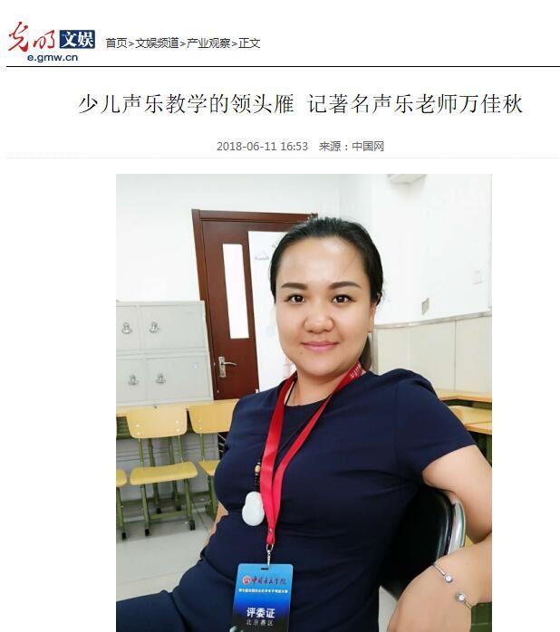 万佳秋老师是人民日报网等中央权威媒体报道的《少儿声乐教学的领头雁-记著名声乐老师万佳秋》这在全中国都是少有的!