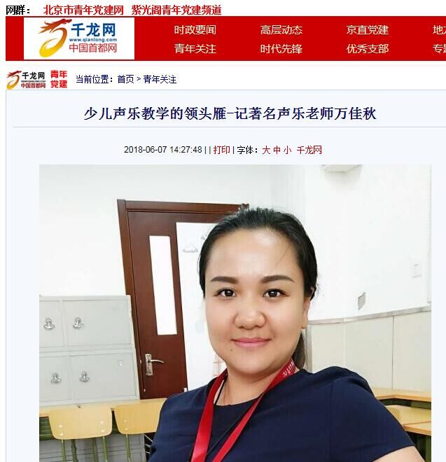 万佳秋老师是人民日报网等中央权威媒体报道的《少儿声乐教学的领头雁-记著名声乐老师万佳秋》这在全中国都是少有的!